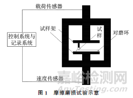 采用X射線衍射儀(XRD)對(duì)涂層物相進(jìn)行分析。采用掃描電子顯微鏡(SEM)觀察涂層不同位置的截面微觀形貌,采用附帶的能譜儀(EDS)進(jìn)行微區(qū)成分分析。采用顯微硬度計(jì)測(cè)試截面顯微硬度,從涂層表面向基體每隔0.25mm取點(diǎn)測(cè)試,距涂層表面相同距離處測(cè)3點(diǎn)取平均值。采用微機(jī)控制萬(wàn)能摩擦磨損試驗(yàn)機(jī)進(jìn)行室溫干滑動(dòng)摩擦磨損測(cè)試,試驗(yàn)裝置如圖1所示,試樣與對(duì)磨環(huán)為面接觸,試樣為圓柱狀,對(duì)磨環(huán)材料為淬火45鋼,采用分析電子天平稱取磨損前后試樣的質(zhì)量,計(jì)算磨損質(zhì)量損失。采用光學(xué)顯微鏡觀察磨損形貌。