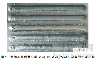 由圖2可以看出:不同MoS2添加量的MoS2/Ni60A 涂層成形良好,沒有產(chǎn)生明顯的宏觀裂紋或氣孔。但是隨著MoS2添加量的增加,涂層表面逐漸粗糙,特別是含質(zhì)量分?jǐn)?shù)7%,9%MoS2的涂層。這是由于過多的MoS2粉末容易發(fā)生團(tuán)聚,導(dǎo)致激光熔覆過程中熔池的流動(dòng)性降低造成的。
