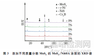 由圖3可見,不同MoS2添加量的MoS2/Ni60A涂層均存在γ-Ni固溶體、MoS2、Cr2B和NiS相。NiS相是由于激光熔覆過程中熔池溫度高達(dá)3000K,造成部分MoS2分解為鉬元素和硫元素,在熔池液體流動(dòng)過程中硫元素與鎳元素反應(yīng)而生成。當(dāng)MoS2添加量(質(zhì)量分?jǐn)?shù),下同)為1%時(shí),MoS2衍射峰不明顯,可能是MoS2分解后含量太低,未檢測(cè)到。