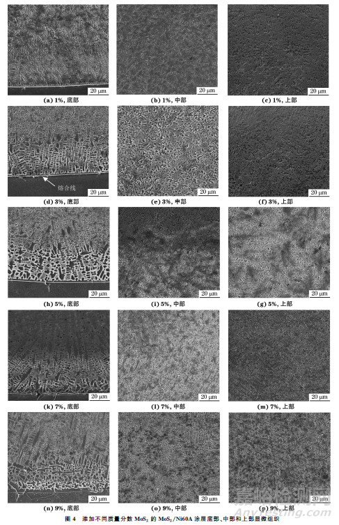 由圖4可見,基體與涂層之間形成了一條光亮且完整無(wú)缺陷的熔合線,說明涂層與基體之間形成了良好的冶金結(jié)合。熔合線附近的組織為近垂直于基體方向定向生長(zhǎng)的平面晶和柱狀晶,這是因?yàn)槿酆暇€附近溫度梯度較大,過冷度較大,金屬液的形核方式為非均勻形核,而涂層的凝固速率較低,使溫度梯度與凝固速率的比值較大,導(dǎo)致晶粒的長(zhǎng)大速率大于形核速率,因此形成了粗大的平面晶和柱狀晶。不同MoS2添加量涂層的相應(yīng)部位的組織基本相似,底部由柱狀晶和平面晶組成,中部和上部由短棒狀、魚骨狀和放射狀的樹枝晶組成。涂層底部的組織最粗大,該區(qū)域是熔池中溫度梯度最大且成分過冷最小的區(qū)域,因此晶粒的長(zhǎng)大速率最快;涂層中部的溫度梯度較大,樹枝晶的生長(zhǎng)條件較好,因此該區(qū)域形成了粗大的樹枝晶;涂層上部的溫度梯度最小,成分過冷最大,溫度梯度與凝固速率的比值較小,晶粒的形核速率大于長(zhǎng)大速率,因此該區(qū)域的組織較細(xì)小。