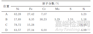 以添加質(zhì)量分?jǐn)?shù)3%MoS2的涂層為例,對(duì)其中部不同位置的微區(qū)成分進(jìn)行分析。由圖5和表1可以看出:涂層中白色和灰色的樹枝晶(位置A和位置D)的微區(qū)成分基本相同,以鎳元素和鐵元素為主,并含有少量鉻元素和硅元素,其中鐵元素一部分來(lái)源于基體,另一部分來(lái)源于Ni60A合金粉末;黑色樹枝晶(位置B)中含量最高的是鉻元素,同時(shí)還存在鉬元素和硫元素,推測(cè)黑色樹枝晶中含有MoS2、NiS硫化物,隨著MoS2添加量的增加,涂層中的黑色區(qū)域增多;基體(位置C)的主要形成元素為鎳元素,可知樹枝晶分布在γ-Ni固溶體上。