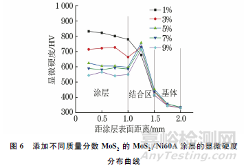 由圖6可見,涂層的顯微硬度均遠(yuǎn)高于基體,這是因?yàn)橥繉觾?nèi)部存在Cr2B硬質(zhì)化合物,同時(shí)基體對(duì)涂層的稀釋起到固溶強(qiáng)化的效果。隨著MoS2含量的增加,涂層的硬度呈現(xiàn)出下降的趨勢(shì),其原因是MoS2作為一種固體自潤(rùn)滑劑其硬度極低,因此會(huì)降低涂層的顯微硬度。在結(jié)合區(qū)內(nèi)除MoS2添加量為1%的涂層外,其他涂層的顯微硬度均隨著MoS2含量的增加呈先升高后降低的趨勢(shì)。先上升的原因?yàn)椋诩す馊鄹驳倪^程中MoS2會(huì)分解成為鉬元素和硫元素,鉬元素能夠固溶到組織內(nèi)部,表現(xiàn)出固溶強(qiáng)化的效果;后下降的原因?yàn)榻Y(jié)合區(qū)下部靠近基體,被基體稀釋的程度太大導(dǎo)致顯微硬度下降。