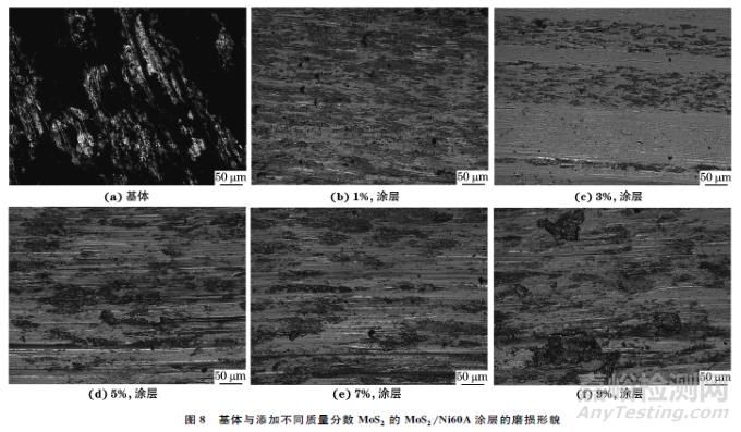 由圖8可見,基體的磨損表面產(chǎn)生了較深的犁溝,且黏著和氧化現(xiàn)象嚴(yán)重,其磨損形式為劇烈的磨粒磨損、黏著磨損和氧化磨損。當(dāng)添加質(zhì)量分?jǐn)?shù)為1%的MoS2時(shí),涂層表面形成了局部的固體潤(rùn)滑膜,磨損表面存在一些微小的犁溝,主要磨損形式為磨粒磨損。當(dāng)添加質(zhì)量分?jǐn)?shù)為3%的MoS2時(shí),固體自潤(rùn)滑膜分布在整個(gè)磨損表面,表面存在少量的犁溝,磨損機(jī)理為輕微的磨粒磨損。當(dāng)添加質(zhì)量分?jǐn)?shù)為5%,7%,9%的MoS2時(shí),雖然在磨損表面上也形成了潤(rùn)滑膜,但是由于涂層的顯微硬度較低,磨損表面產(chǎn)生了大量粗且深的犁溝以及剝落坑,這是由于對(duì)磨環(huán)對(duì)涂層表面的反復(fù)摩擦和擠壓使涂層次表面萌生了疲勞裂紋,同時(shí)摩擦磨損過程中產(chǎn)生的熱量無(wú)法及時(shí)消散,導(dǎo)致對(duì)磨環(huán)與涂層表面之間產(chǎn)生了黏著效應(yīng),最終在黏著力和機(jī)械剪切力的反復(fù)作用下,涂層脫落形成剝落坑;此時(shí)涂層的主要磨損形式為劇烈的磨粒磨損和黏著磨損。