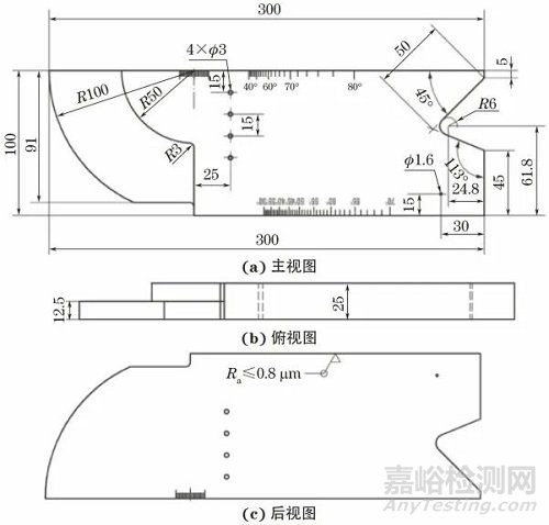 校準(zhǔn)試塊應(yīng)符合ISO 19675:2017《無損檢測 超聲檢測 相控陣檢測校準(zhǔn)試塊規(guī)范》要求,試塊結(jié)構(gòu)如圖1所示,主要用于聲速校準(zhǔn)、楔塊延遲校準(zhǔn)和ACG校準(zhǔn)。