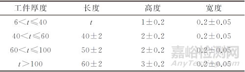 驗(yàn)證試塊用于規(guī)程可行性和檢測能力評估。驗(yàn)證試塊應(yīng)具有人工反射體,厚度應(yīng)具有代表性,試塊材料聲學(xué)特性與被檢工件相同或相近,具有產(chǎn)品焊縫的特征(包括焊接方法、焊縫坡口、焊縫尺寸應(yīng)與實(shí)際工件一致),自然缺陷或人工缺陷應(yīng)是制造工藝中出現(xiàn)的典型缺陷(類型、尺寸、位置)。驗(yàn)證試塊應(yīng)可追溯至制造材料;反射體的數(shù)量和位置應(yīng)足以保證檢測的可靠性;反射體的長度、高度和位置應(yīng)各不相同,缺陷之間的距離不能太近。