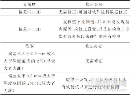 如果參考試塊用于初始設(shè)置,則應(yīng)使用同一試塊進(jìn)行復(fù)核,也可以使用體積較小,傳輸特性已知的試塊進(jìn)行復(fù)核。如果在復(fù)核過程中發(fā)現(xiàn)數(shù)據(jù)與初始設(shè)置存在偏差,則應(yīng)按表4進(jìn)行修正。