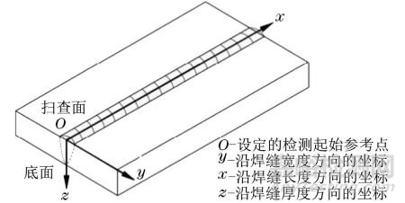 通過相關(guān)指示確定不連續(xù)平行于焊縫軸線的位置x、垂直于焊縫軸向y和焊縫厚度方向的位置z,坐標(biāo)定義如圖4所示。