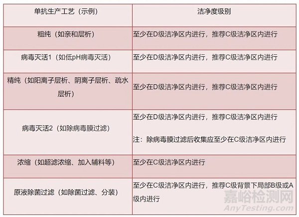 單抗生產(chǎn)過(guò)程中嚴(yán)格執(zhí)行GMP,以上法規(guī)對(duì)單抗原液車間生產(chǎn)工藝布局和潔凈區(qū)環(huán)境級(jí)別有具體明確的要求,根據(jù)目前國(guó)內(nèi)實(shí)踐經(jīng)驗(yàn),單抗下游生產(chǎn)工藝的潔凈區(qū)域劃分原則建議見(jiàn)下表: