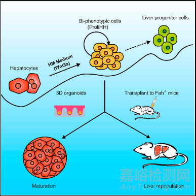 增殖性的人肝細(xì)胞(proliferating human hepatocytes , ProliHHs)是一種雙表型細(xì)胞,一方面其保留了成熟肝細(xì)胞的一些特征,如包括血漿蛋白分泌、糖原儲(chǔ)存和脂質(zhì)積累,另一方面其表達(dá)祖細(xì)胞相關(guān)基因。當(dāng)ProliHHs用于肝臟移植時(shí),其在體內(nèi)能夠轉(zhuǎn)變?yōu)槌墒斓母闻K細(xì)胞,填充約60%的肝臟;當(dāng)用于傳代時(shí),細(xì)胞中與成熟相關(guān)的基因顯著減少,與祖細(xì)胞相關(guān)的基因增加。表征人類肝細(xì)胞衍生的雙表型細(xì)胞是高度增殖的細(xì)胞,具有強(qiáng)大的再生能力。
