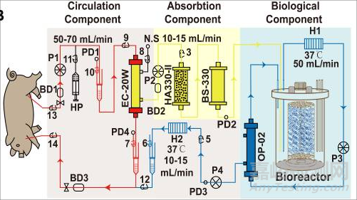 組合型人工肝其工作模式如下圖所示:將動(dòng)物血液提取后通過血泵提供動(dòng)力進(jìn)行循環(huán)(紅線標(biāo)識(shí),速度:50 mL/min、壓力:100 mmHg ),同時(shí)以500U / h為基線注射肝素用來維持活化的凝血激酶時(shí)間在175 s和250 s之間。黃色區(qū)域表示非生物型人工肝代謝過程,血漿通過含有活性炭和膽紅素的吸附柱進(jìn)行吸附,吸附完成后進(jìn)入生物人工肝部分(藍(lán)色區(qū)域),由肝細(xì)胞解毒,然后運(yùn)輸?shù)降诙€(gè)中空纖維膜血漿分離器(OP-02,330μm)中,用于阻止?jié)撛诘拿撀浼?xì)胞和片段。最后,純化的血漿以50mL / min的速度和50-70mmHg的壓力返回動(dòng)物體內(nèi)。(氣泡檢測(cè)器:BD1,BD2和BD3;壓力檢測(cè)器PD1、PD2、PD3 和 PD4;加熱器H1和H2)。