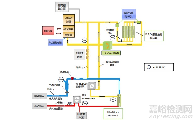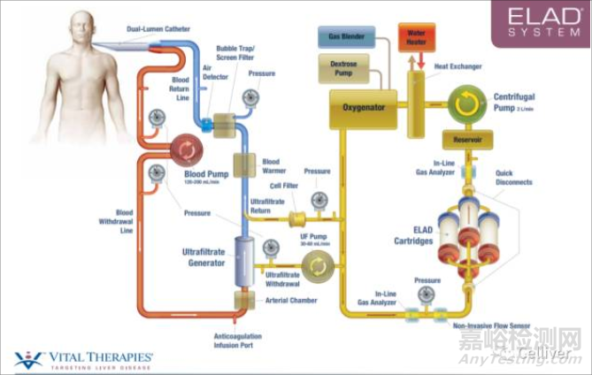 ELAD治療系統(tǒng)將ELAD細(xì)胞生物反應(yīng)器裝置連接到患者的血液循環(huán)系統(tǒng),以提供持續(xù)的肝臟支持治療,系統(tǒng)圖如下圖所示。