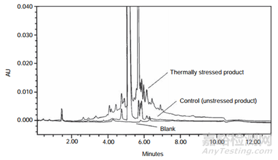 圖3使用陡梯度HPLC方法在高溫破壞樣品,未破壞樣品和空白樣品上獲得的HPLC色譜圖疊加圖