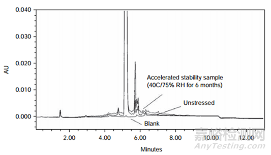 圖4 使用陡梯度HPLC方法分析6個月加速穩(wěn)定性條件下的樣品,未破壞的樣品和空白所獲得的疊加HPLC色譜圖