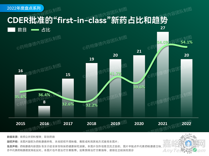 ▲2015年到2022年FDA下屬CDER批準(zhǔn)的新藥中,“first-in-class”(FIC)的新藥數(shù)目與占比,點(diǎn)擊圖片可觀看大圖(數(shù)據(jù)來(lái)源:公開(kāi)資料整理,數(shù)據(jù)來(lái)自CDER發(fā)布的年度報(bào)告)
