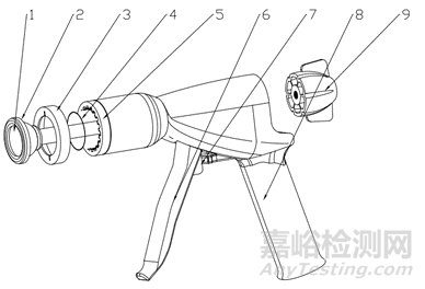 1.龜頭罩1.抵釘座3.釘倉蓋4.吻合釘墊圈5.釘倉6.活動手柄7.保險扣8.固定手柄9.調(diào)節(jié)旋鈕