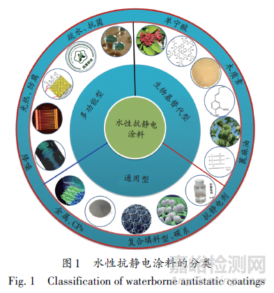 鑒于抗靜電涂料水性化技術(shù)的不斷發(fā)展,本文對通用型的水性抗靜電涂料,抗靜電與疏水、殺菌、防腐等復(fù)合的多功能型體系,及生物質(zhì)替代化石原料體系等方面(圖1)的研究進展進行了綜述,以期推動本領(lǐng)域的發(fā)展,并給未來的研究提供一些思路和指導(dǎo)。