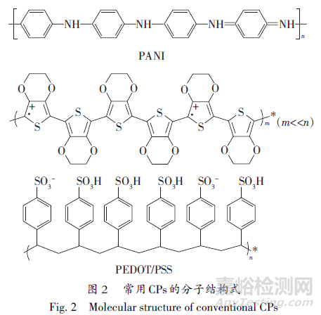 與無機金屬或碳系填料相比,CPs具有易加工、輕質(zhì)、導(dǎo)電性可控等優(yōu)點,不僅可以作為有機導(dǎo)電填料與水性樹脂共混,而且自身也可同時作為成膜物質(zhì),不需要再外加高分子基體材料,直接制備水性抗靜電涂料。另外,作為具有豐富結(jié)構(gòu)和光、電、磁、力、催化等特性的本征導(dǎo)電高分子,還容易實現(xiàn)涂層抗靜電與防腐、電磁屏蔽、殺菌等功能協(xié)同。目前,水性抗靜電涂料領(lǐng)域應(yīng)用的CPs 主要有由聚苯胺(PANI)和聚(3,4-乙撐二氧噻吩)/聚苯乙烯磺酸(PEDOT/PSS)2種(圖2)。這主要得益于PANI的廉價性和可水相加工性,及PEDOT/PSS本身作為商品化水性分散液的特殊優(yōu)勢。