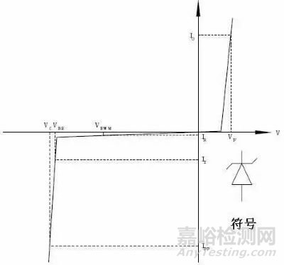 器件在發(fā)生擊穿的區(qū)域內(nèi),在規(guī)定的試驗(yàn)電流I(BR)下,測(cè)得器件兩端的電壓稱為擊穿電壓,在此區(qū)域內(nèi),二極管成為低阻抗的通路。