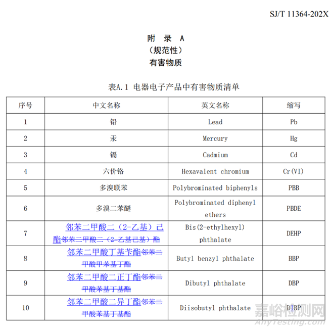 標(biāo)準(zhǔn)最大的變化在于附錄A有害物質(zhì)清單加入了4項(xiàng)鄰苯二甲酸酯。修訂版生效后,企業(yè)需要按附錄A的順序標(biāo)注電器電子產(chǎn)品中有害物質(zhì)的名稱(chēng)及含有信息(如下圖所示)。