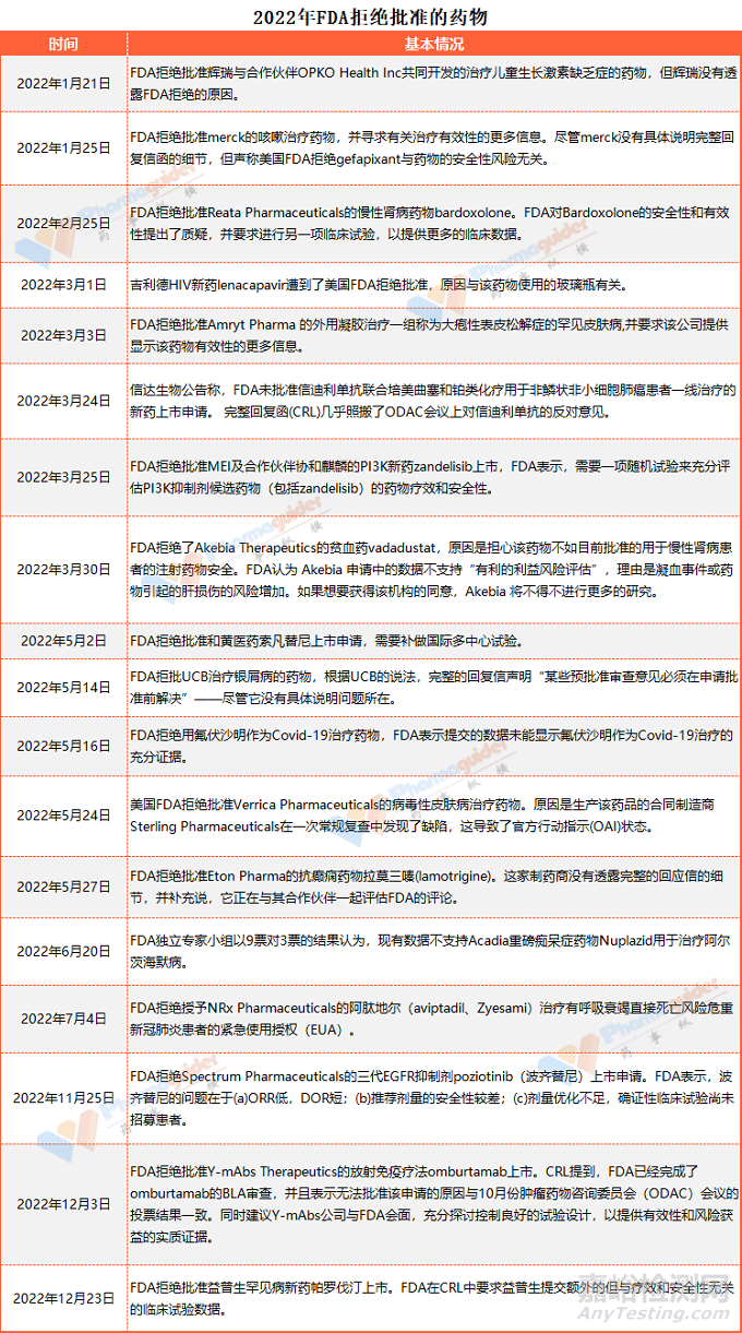 FDA手握“生殺大權(quán)”,不僅影響著大藥企,還決定著眾多Biotech的生死,也牽動著國內(nèi)藥企們的心。據(jù)不完全統(tǒng)計,2022年有18款藥物被拒,涉及治療新冠藥物、罕見病、抗體藥、兒童生長激素、阿爾茨海默癥、放射免疫療法等各個方面,看看原因何在?
