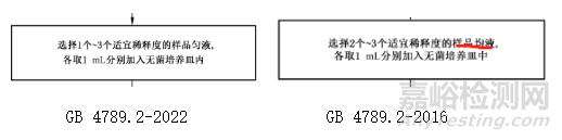 對于試驗過程中的一些操作,2022版標準進行了更加細化的描述,比如6.1.3中,明確描述為稀釋液需要“在振蕩器上振蕩混勻,制成1∶100的樣品勻液”,而不再沿用2016版本中“振搖試管或換用1支無菌吸管反復吹打使其混合均勻,制成1∶100的樣品勻液”的說法。這一描述更加規(guī)范,也更加科學。