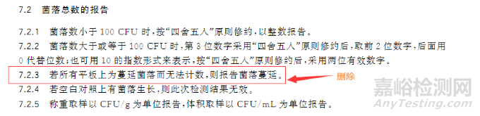 11)因6.2.1有防止菌落在瓊脂培養(yǎng)基表面彌漫生長的處理,刪除了“7.2.3 若所有平板上為蔓延菌落而無法計數(shù),則報告菌落蔓延。”