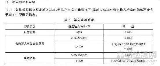 GB 4706.1-2005《家用和類似用途電器的安全 第1部分 通用要求》中對(duì)家用電器的輸入功率偏差要求如下: