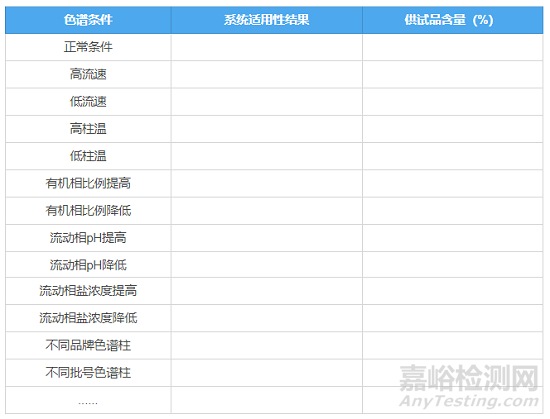 按照擬定標(biāo)準(zhǔn)配制空白溶劑、對照品溶液和供試品溶液(系統(tǒng)適用性溶液視情況配制),計(jì)算不同條件下供試品的含量測定結(jié)果,關(guān)注系統(tǒng)適用性是否符合標(biāo)準(zhǔn)要求(有時(shí)方法中并不擬定配制系統(tǒng)適用性溶液,而是規(guī)定主峰理論板數(shù)和拖尾因子等,也要相應(yīng)關(guān)注和統(tǒng)計(jì))