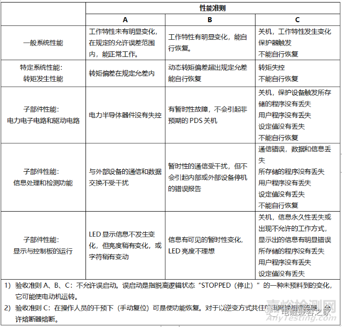 針對(duì)PDS及其子部件按給定騷擾的影響,抗擾度試驗(yàn)分為A、B、C三種驗(yàn)收(性能)準(zhǔn)則: