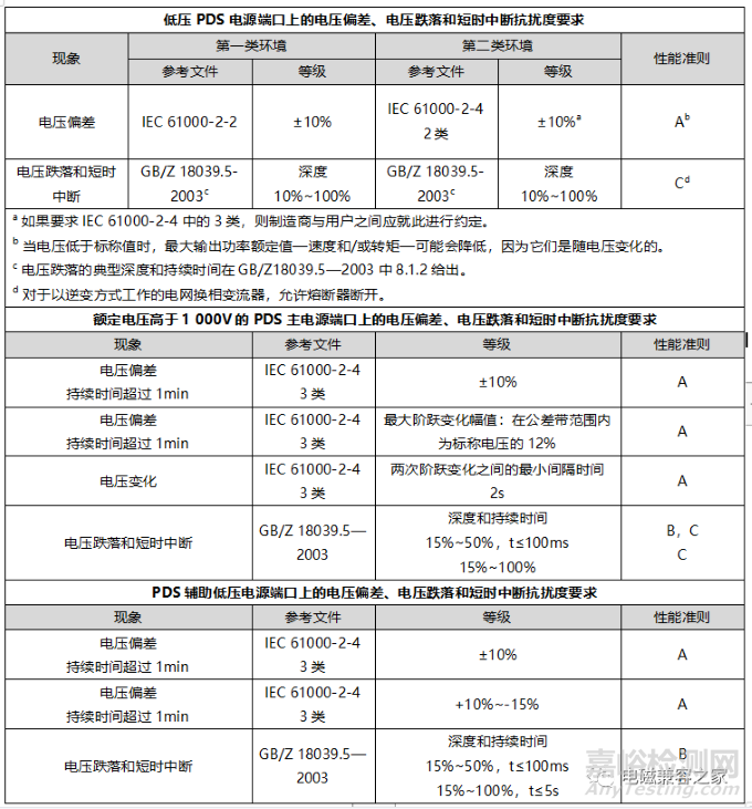 GB 12668.3規(guī)定了PDS系統(tǒng)或部件電壓偏差(變動(dòng)、變化、波動(dòng))、電壓跌落和短時(shí)中斷抗擾度要求如下。