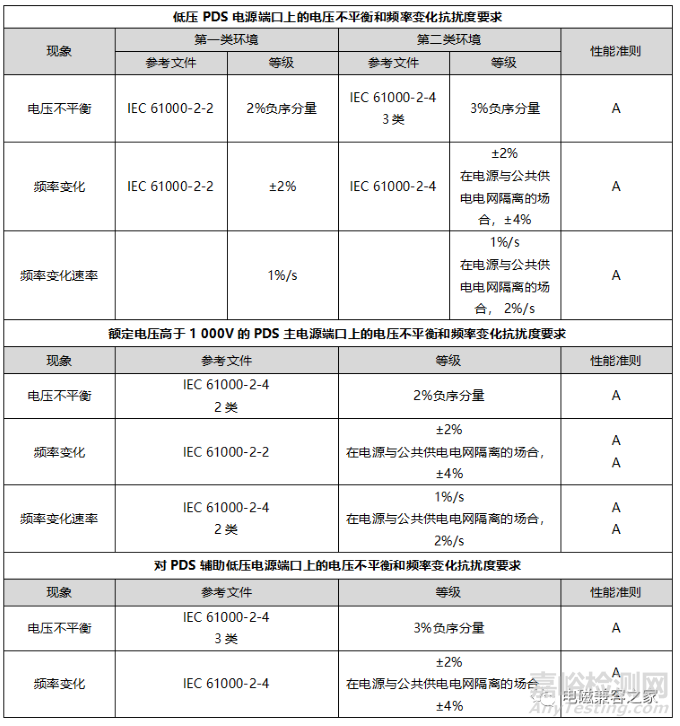 GB 12668.3規(guī)定了PDS系統(tǒng)或部件電壓不平衡和頻率變化抗擾度要求如下。