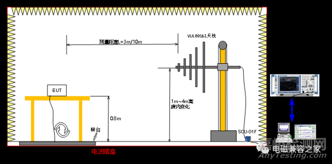 CISPR 16等標(biāo)準(zhǔn)規(guī)定,EUT需要在開(kāi)闊場(chǎng)地或電波暗室進(jìn)行30MHz以上的輻射發(fā)射測(cè)試。EUT放在地平面上規(guī)定的高度并模擬正常運(yùn)行狀態(tài)來(lái)布置。天線按規(guī)定的距離放置。在水平面內(nèi)旋轉(zhuǎn)EUT并記下最大的讀數(shù)。再調(diào)節(jié)天線高度,使直射波和地面反射波接近或達(dá)到同相疊加,找出最大的騷擾值。