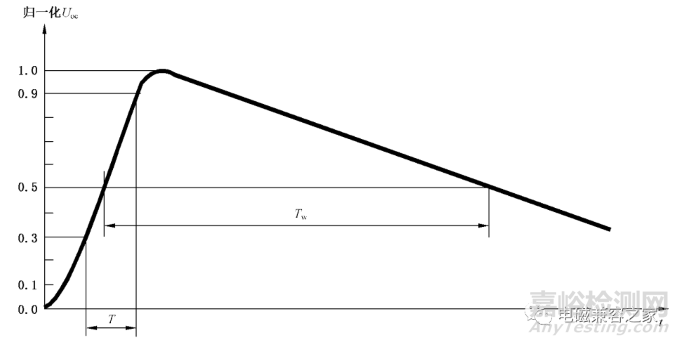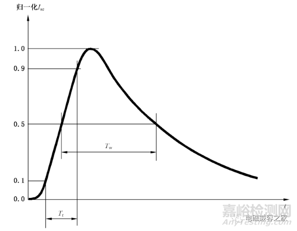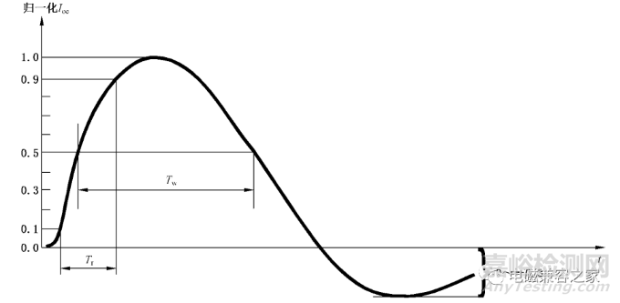 其中Tw為持續(xù)時(shí)間,定義為電流波形在上升沿和下降沿分別為50%峰值電流之間經(jīng)過(guò)的時(shí)間,T為波前時(shí)間,定義為電流波形上升沿在30%峰值電壓和90%峰值電流之間經(jīng)過(guò)的時(shí)間:波形峰值50%~50%經(jīng)過(guò)的時(shí)間,T為波前脈沖峰值30~90%經(jīng)過(guò)的時(shí)間。標(biāo)準(zhǔn)定義: