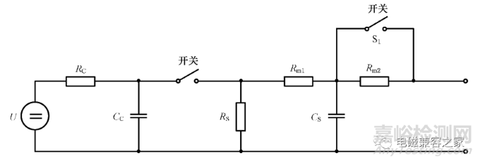 如圖5的(1.2/50)µs-(8/20)µs波形發(fā)生器的電路原理圖所示,浪涌發(fā)生器的電路是由兩個(gè)部分構(gòu)成,分別為充電回路和脈沖形成回路。充電回路的電路由高壓發(fā)生器 U、充電電阻Rc和儲(chǔ)能電容Cc組成,脈沖形成回路的電路由脈沖持續(xù)時(shí)間調(diào)節(jié)電阻RS1、RS2、阻抗匹配電阻Rm和調(diào)節(jié)上升時(shí)間形成的電感Lr組成。