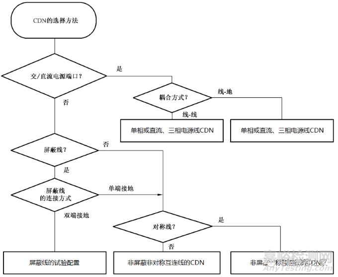 在進(jìn)行測(cè)試時(shí),應(yīng)根據(jù)不同的產(chǎn)品來(lái)選擇相對(duì)應(yīng)的耦合去耦網(wǎng)絡(luò),其選擇方法見(jiàn)圖7: