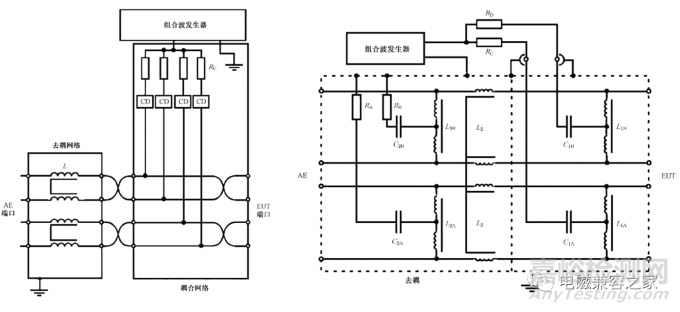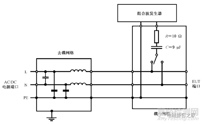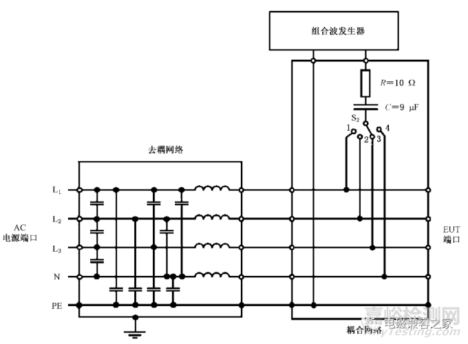 雷擊浪涌耦合去耦網(wǎng)絡(luò)按照其工作原理可以分為耦合網(wǎng)絡(luò)部分和去耦網(wǎng)絡(luò)部分。耦合網(wǎng)絡(luò)的作用是將組合波發(fā)生器的浪涌信號(hào)傳送到被測(cè)設(shè)備上,限制從被測(cè)設(shè)備的電源線流入組合波發(fā)生器的電流對(duì)發(fā)生器本體造成破壞,減小對(duì)浪涌波形的影響。去耦網(wǎng)絡(luò)的作用是為浪涌信號(hào)提供足夠的去耦阻抗,避免浪涌信號(hào)竄入電網(wǎng)對(duì)由同一電源供電的非受試設(shè)備產(chǎn)生不利影響。此外,連接到同一電源的其他設(shè)備可能含有防雷器件,在不使用去耦網(wǎng)絡(luò)的情況下,非受試設(shè)備上防雷器件會(huì)阻止EUT上浪涌的施加及影響浪涌試驗(yàn)結(jié)果。