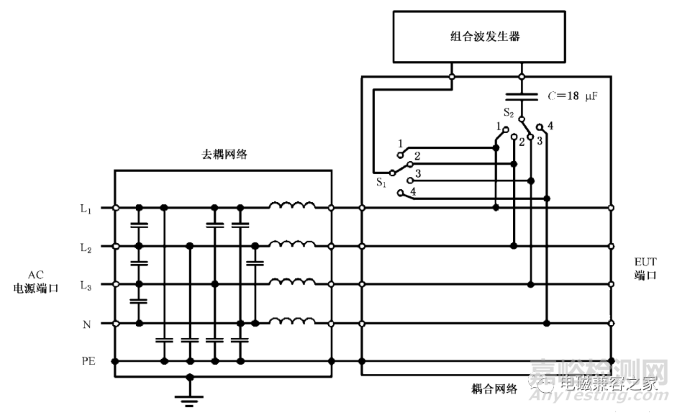 在標(biāo)準(zhǔn)GB/T 17626.5-2019中給出了耦合去耦網(wǎng)絡(luò) 的電路拓?fù)鋱D,圖8至圖11分別為單相/直流電源耦合去耦網(wǎng)絡(luò)線對(duì)線耦合、單相/直流電源耦合去耦網(wǎng)絡(luò)線對(duì)地耦合、三相電源耦合去耦網(wǎng)絡(luò)線對(duì)線耦合和三相電源耦合去耦網(wǎng)絡(luò)線對(duì)地耦合。
