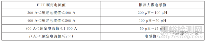去耦電感L的選取不宜太大,否則既會(huì)使耦合/去耦網(wǎng)絡(luò)上有較大的電壓壓降,又會(huì)造成電感體積龐大,給生產(chǎn)制造和安裝帶來(lái)不便。一般來(lái)說(shuō),為了達(dá)到標(biāo)準(zhǔn)中規(guī)定的:“耦合/去耦網(wǎng)絡(luò)上產(chǎn)生的壓降在額定電流情況下不超過(guò)耦合/去耦網(wǎng)絡(luò)輸入電壓的10%”。以被測(cè)品每相額定電流≤200A計(jì),L值應(yīng)≤1.5mH,當(dāng)額定電流>200A 時(shí),L值如圖12所示。