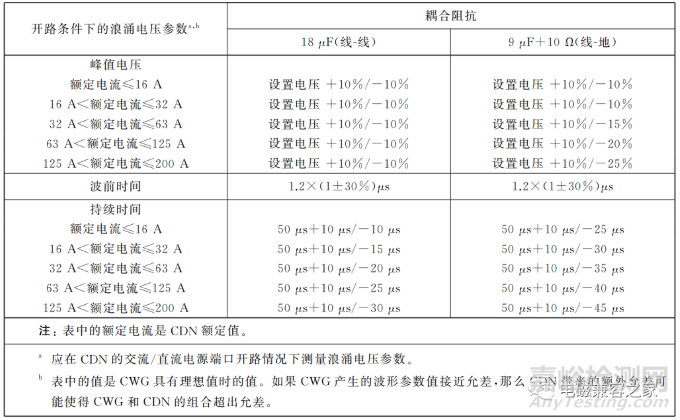 GB/T 17626.5-2019對(duì)于組合波發(fā)生器的輸出端參數(shù)有以下要求,見(jiàn)表1和表2。