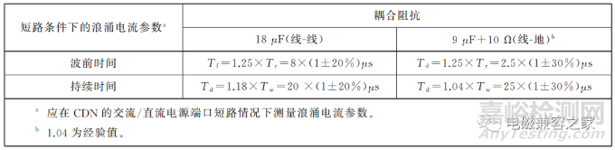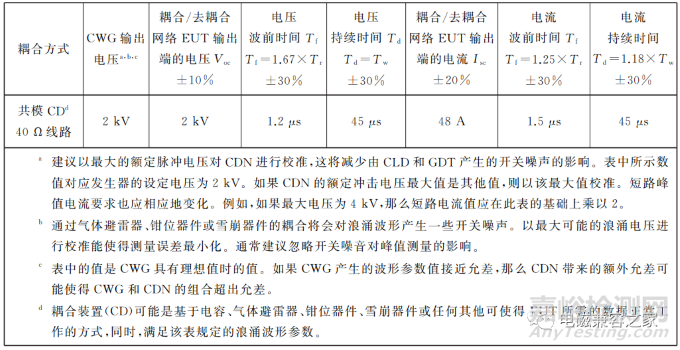表2組合波發(fā)生器輸出端雷擊浪涌波形-時(shí)間參數(shù)的允差范圍
