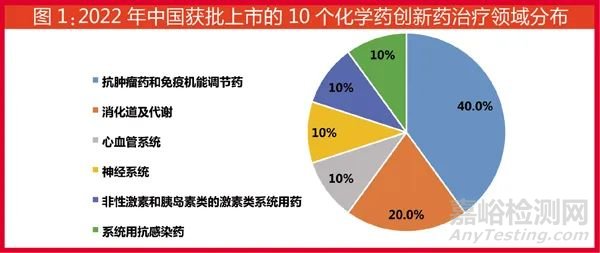 2022年國內(nèi)批準(zhǔn)上市10個化學(xué)藥創(chuàng)新藥治療領(lǐng)域分布(詳見圖1),抗腫瘤藥和免疫機(jī)能調(diào)節(jié)藥較多,占40%。其次是消化道與代謝領(lǐng)域用藥,占比為20%;再次是心血管系統(tǒng)、神經(jīng)系統(tǒng)、系統(tǒng)用抗感染藥等領(lǐng)域用藥,各占10%。