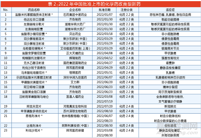 2022年國內(nèi)批準(zhǔn)上市31個化學(xué)藥改良型新藥(詳見表3),數(shù)量略多于2021年的28個,同比增長了11%。