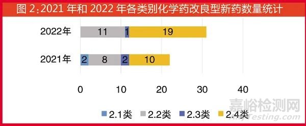 2021年和2022年獲批的化學(xué)藥改良型新藥各亞類藥品數(shù)對比統(tǒng)計(jì)見圖2。2022年獲批上市的化學(xué)藥改良型新藥多為新適應(yīng)癥(19個/31個)。