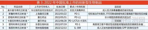 2022年,國內(nèi)批準(zhǔn)上市6個創(chuàng)新型生物制品品種(詳見表3),數(shù)量比2021年的9個微降。其中,有5個新藥為全球首次批準(zhǔn),3個為國產(chǎn)PD-1/PD-L1抑制劑,4個為國內(nèi)公司自主研發(fā)的品種。