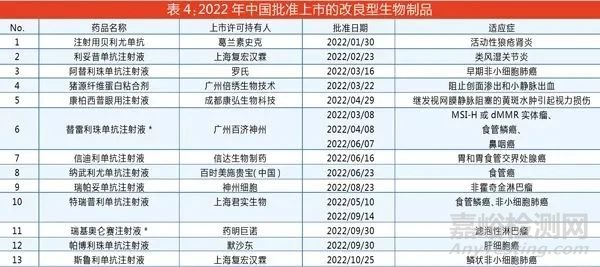 2022年,國內(nèi)批準(zhǔn)上市改良型生物制品品種13個(詳見表4),除瑞帕妥單抗注射液為原治療用生物制品2類單克隆抗體外,其余為治療用生物制品2.2類(新適應(yīng)癥/改變用藥人群),這些品種多為抗腫瘤藥和免疫機(jī)能調(diào)節(jié)藥(11個/13個)。