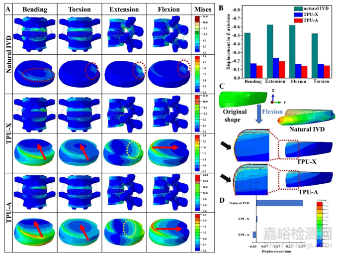 進(jìn)一步通過人體腰椎及椎間盤有限元模型分析材料在各種實(shí)際載荷條件(彎曲、扭轉(zhuǎn)、伸展和屈曲)下的力學(xué)行為,TPU-A支架作為腰椎間盤植入物相較于天然椎間盤和正泊松比TPU-X支架的應(yīng)力傳遞和耗散更加均勻,且具有更好的抗外部載荷的能力。值得強(qiáng)調(diào)的是,TPU-A植入物在人體載荷下不同于天然椎間盤的明顯膨出及TPU-X的輕微隆出,而是表現(xiàn)出基于負(fù)泊松比效應(yīng)的收縮,可有效預(yù)防椎間盤突出(圖5)。