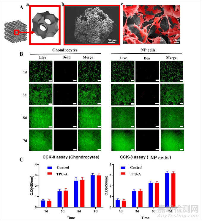 該TPU-A植入物與軟骨細(xì)胞及椎間盤髓核細(xì)胞共培養(yǎng),發(fā)現(xiàn)其具有優(yōu)異的生物相容性及細(xì)胞粘附性(圖6)。
