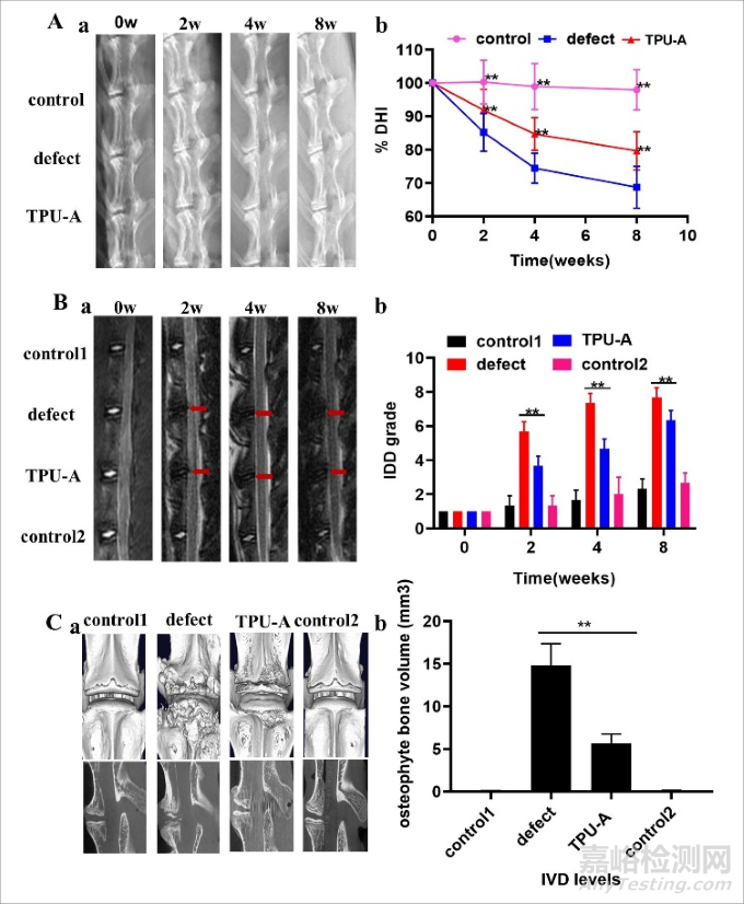 圖7 TPU-A植入兔子椎間盤后的核磁及影像學(xué)評(píng)估