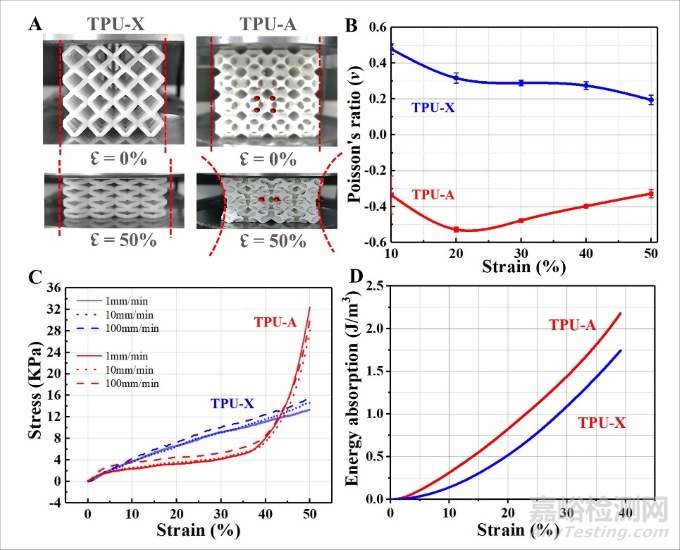 首先,設(shè)計(jì)構(gòu)建相同體積分?jǐn)?shù)的正負(fù)泊松比模型,并通過3D打印成型TPU-X(正泊松比)和TPU-A(負(fù)泊松比)支架,通過有限元分析驗(yàn)證TPU-A相較于天然椎間盤和TPU-X具有更均勻的應(yīng)力分布,且TPU-A表現(xiàn)出典型的負(fù)泊松比效應(yīng),這一效應(yīng)對(duì)椎間盤退變的抑制作用通過模型進(jìn)行了直觀展示(圖1)。