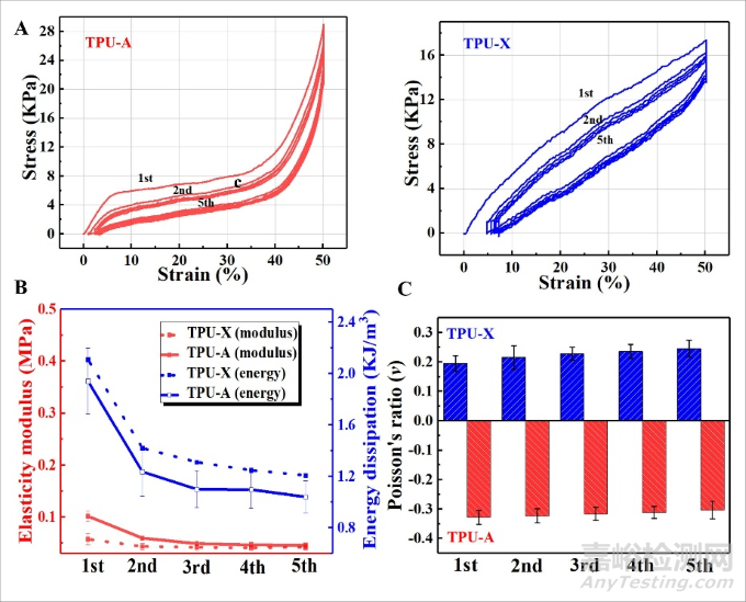 隨后,通過體外力學(xué)測(cè)試分析了TPU-X和TPU-A支架在不同應(yīng)變下的泊松比值,分析比較兩種支架的應(yīng)力應(yīng)變曲線、能量吸收、加載-卸載循環(huán)曲線、多次循環(huán)下的彈性模量及耗散能,結(jié)果表明TPU-A支架因其改良的“Bucklicrystal”結(jié)構(gòu)而表現(xiàn)出優(yōu)異的力學(xué)性能(圖2,3)。